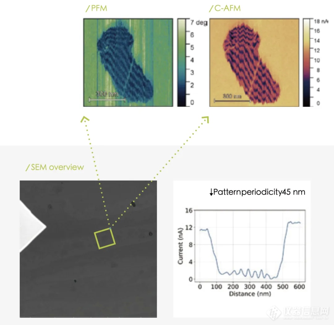 使用 Phenom AFM-SEM 原子力扫描电镜一体机,对在碳化硅(SiC)上的石墨烯双层进行电学性质测量,样品上的不同 PFM 和 C-AFM 对比表明,扭曲和未扭曲的石墨烯双层都存在。重点关注扭曲部分,可以观察到以 45 纳米周期性的莫尔图案的调制。”