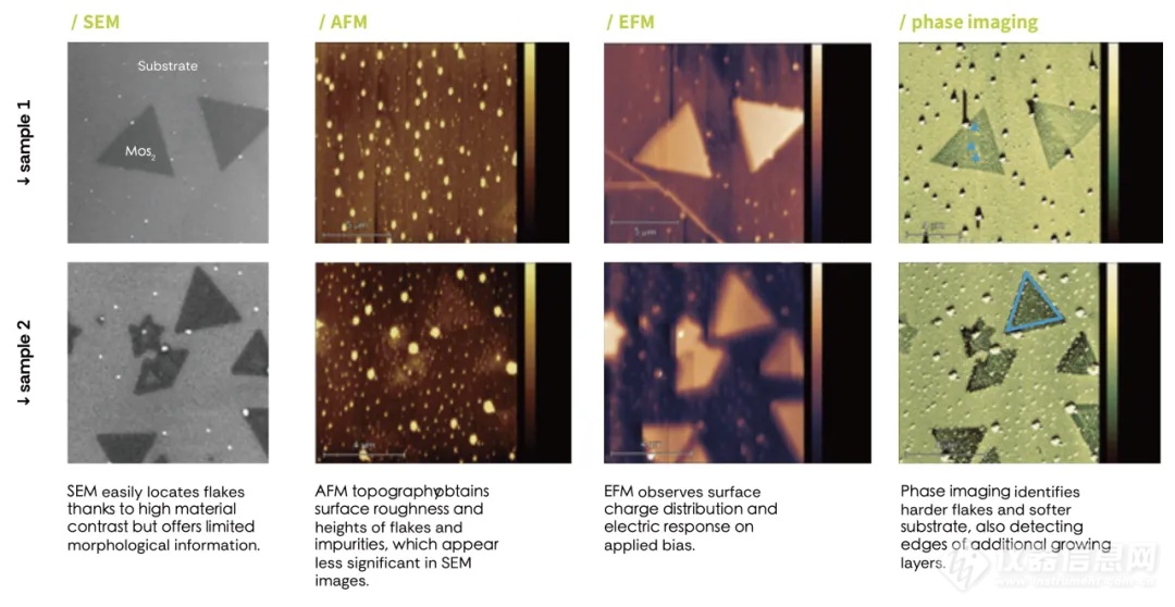 使用 Phenom AFM-SEM 原子力扫描电镜一体机,可以对通过化学气相沉积(CVD)在厚 SiO2/Si 上生长的 MoS2 薄片进行精确和复杂分析。对两组不同制备条件的样品同时进行了扫描电子显微镜(SEM)、原子力显微镜(AFM)、静电力显微镜(EFM)和相位成像测量,以比较结果并确定实现所需样品特征的制备参数。